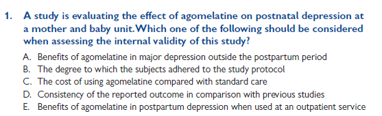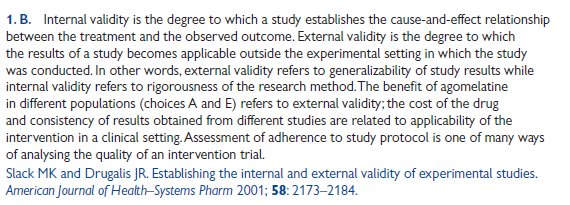 populations (choices A and E) refrs to external validity; the cost of the drug and